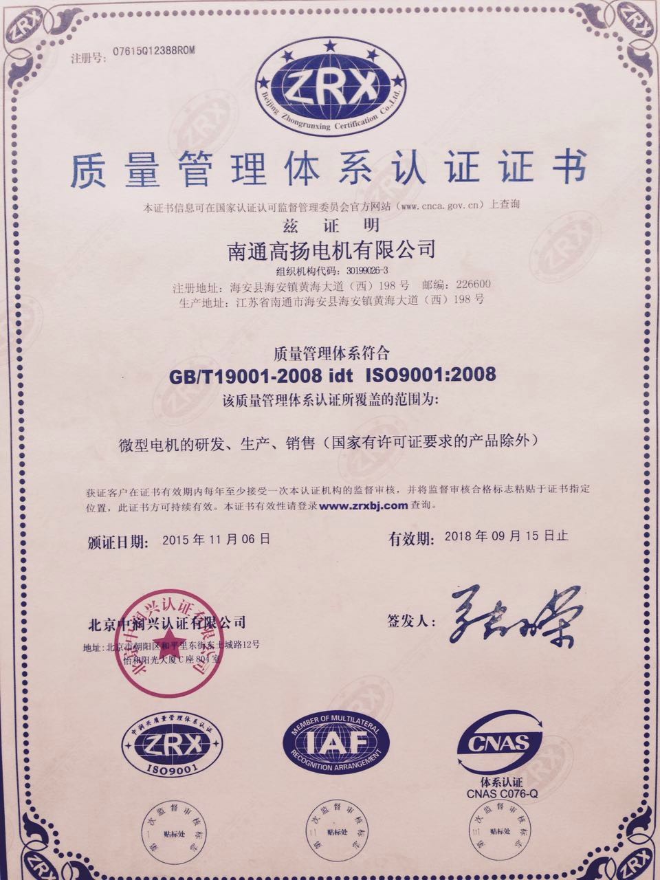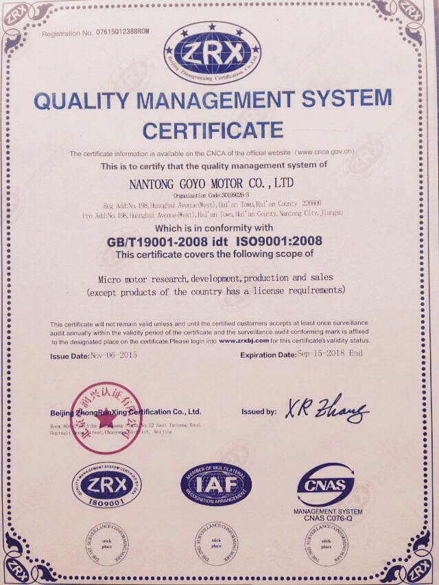 高扬电机 ISO-9001证书